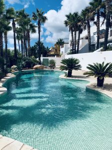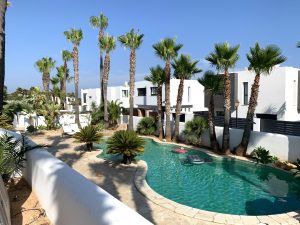 Neben dem Wohn-/Esszimmer mit Küche befinden sich 2x Schlafzimmer und 2x Badezimmer mit Büro oder 3. Schlafzimmer. Das Anwesen, sehr gepflegt, die Terrasse mit Chill-Out- und Loungebereich, teilweise überdachte Terrasse, eine schöne Liegewiese und eine wunderschöne Poollandschaft.